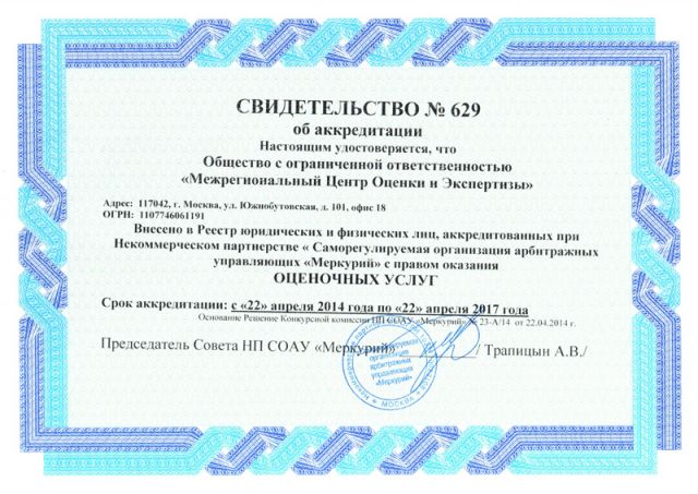Наша компания по дополнительной договоренности может пройти аккредитацию в любом СРО РФ для выполнения работ по заданию арбитражного управляющего, состоящего в этом СРО. МЦОЭ соответствует всем требованиям СРО арбитражных управляющих и процедура аккредитации, как правило, занимает 3-5 дней.